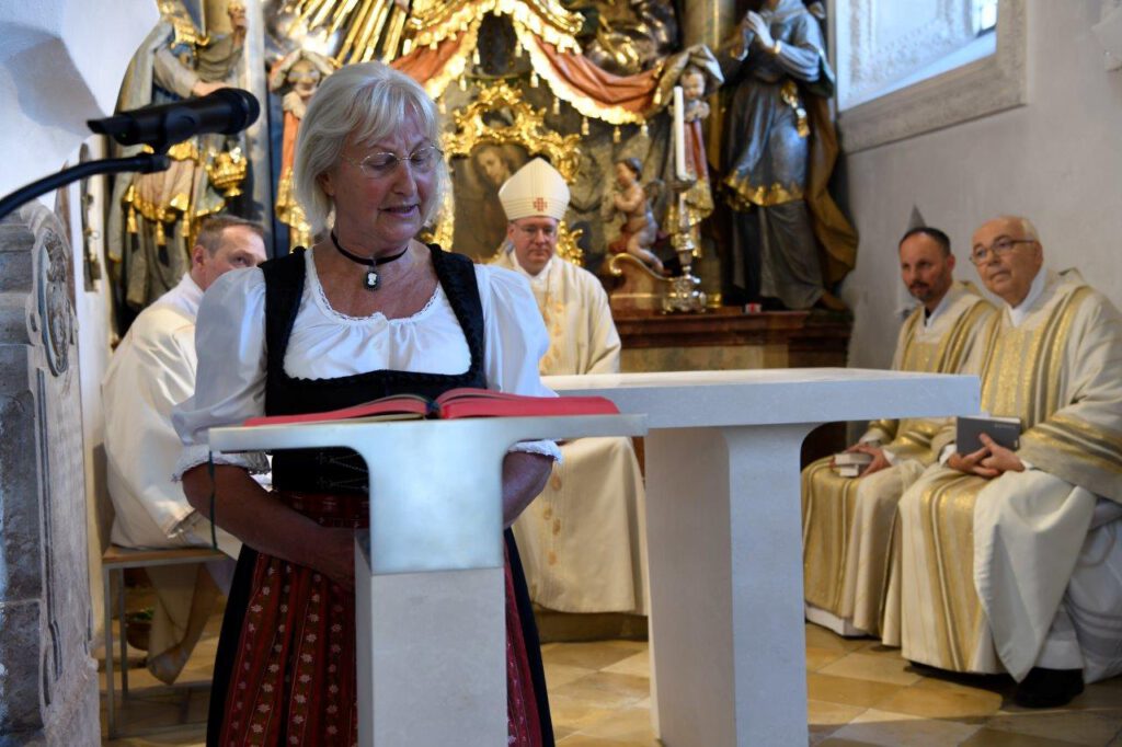 Frau Hartmann trägt am neuen Ambo zu ersten Mal eine Lesung vor. Er ist der Tisch des Wortes Gottes, von dem Jesus uns sagt, dass es wirklich eine Speise ist (Joh 6,55).