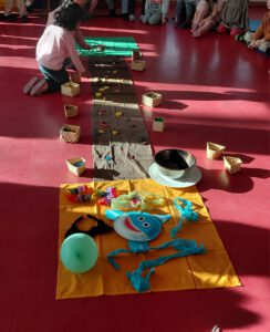Den Weg in unserer Mitte, der Richtung Ostern führt, konnten die Kinder schmücken und ein Stück von sich einbringen. Mit der Jesuskerze und dem Lied: Lasset uns gemeinsam, dankten wir Gott, weil er immer bei uns ist.