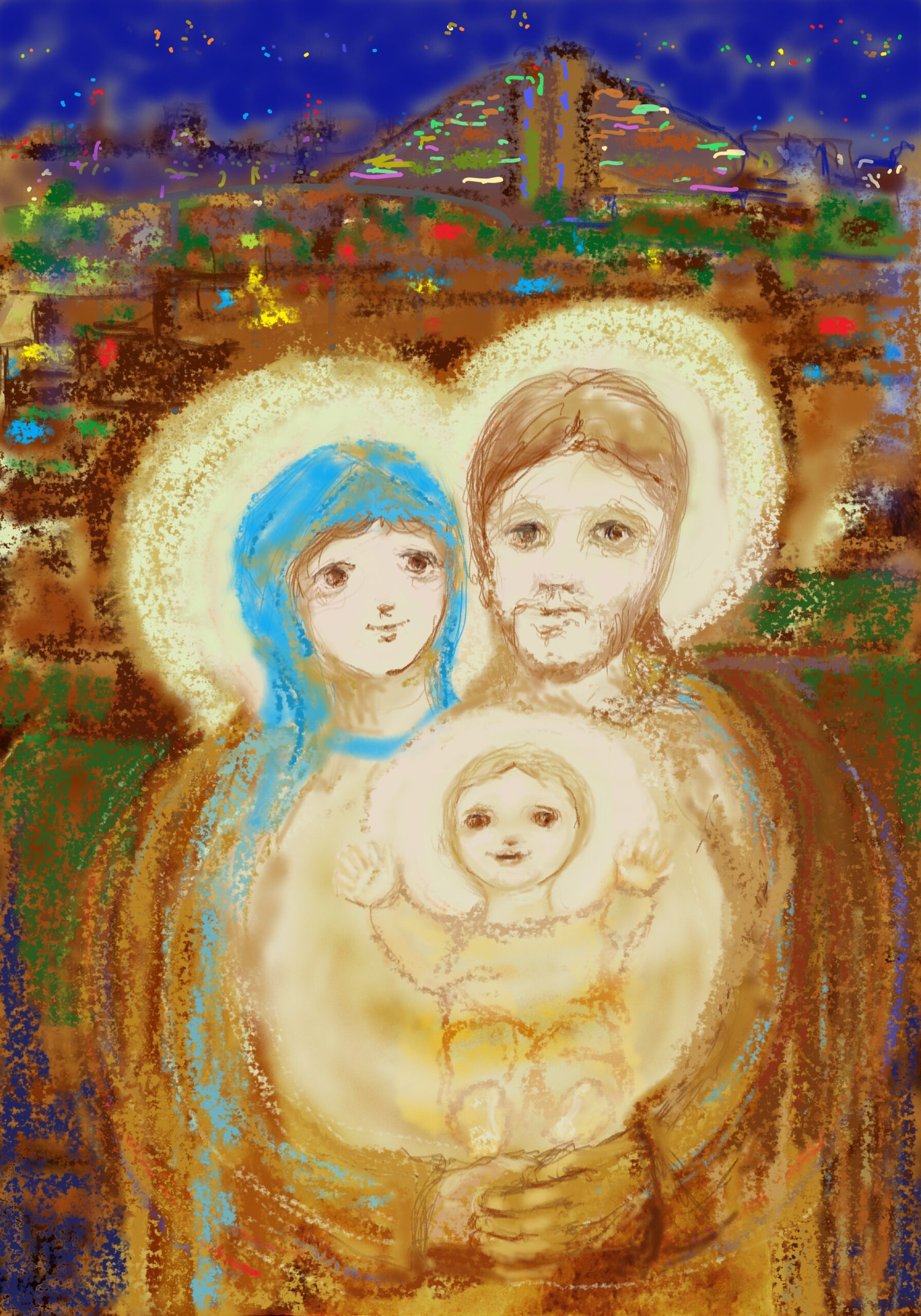 was entdecken Sie im Hintergrund unseres diesjährigen Weihnachtsbildes? Ich sehe darin die Silhouette von Oberföhring und Johanneskirchen mit dem Pharaohaus und links im Hintergrund dem Kirchturm von St. Lorenz. In der Mitte des Bildes ist die Heilige Familie. Das göttliche Kind geborgen in den Armen von Maria und Josef. Sie strahlen Wärme und Licht aus. Dadurch werden Häuser und Wohnungen, ja sogar der Himmel über dem dunklen Stadtteil in bunte Farben getaucht.