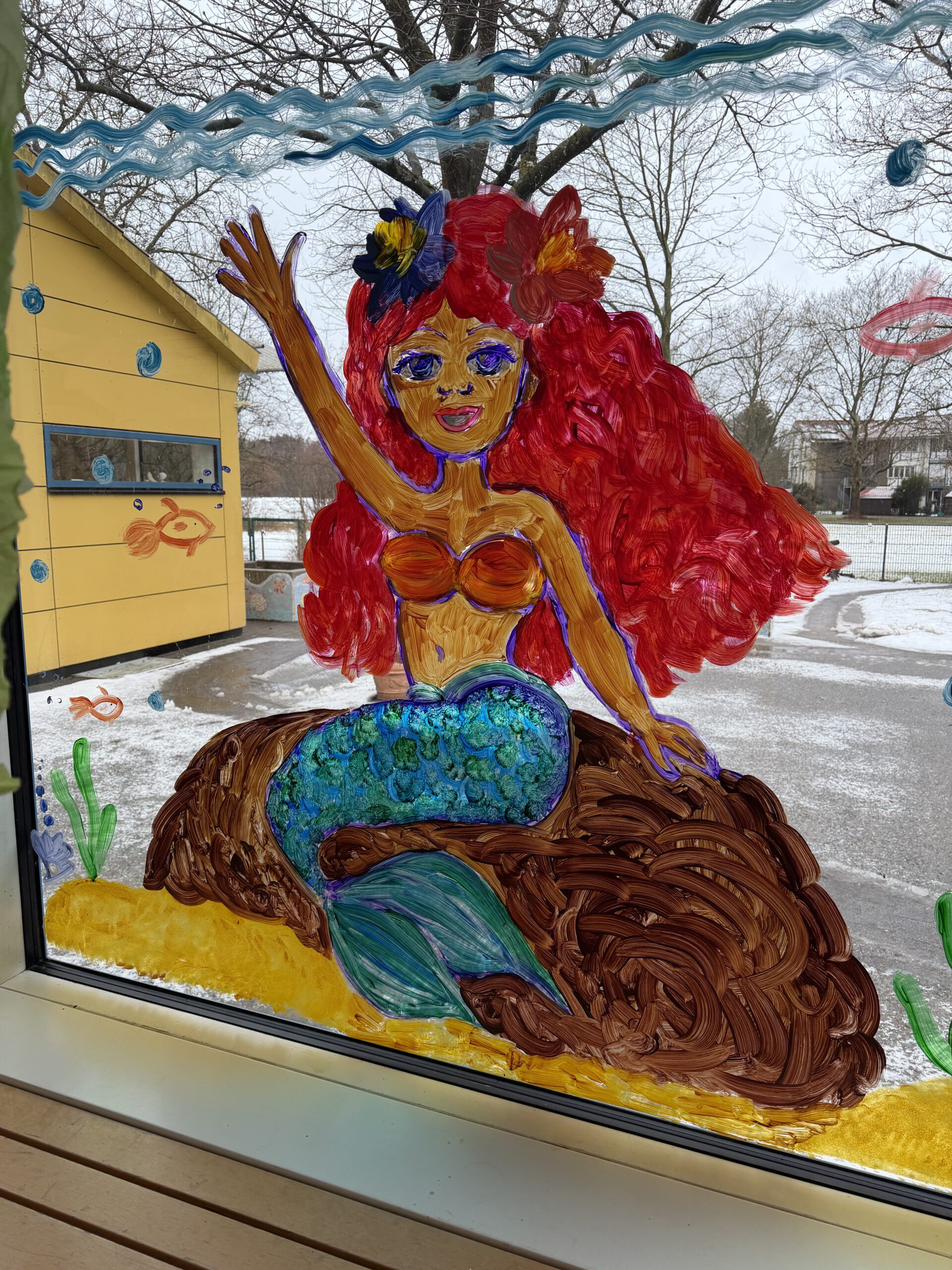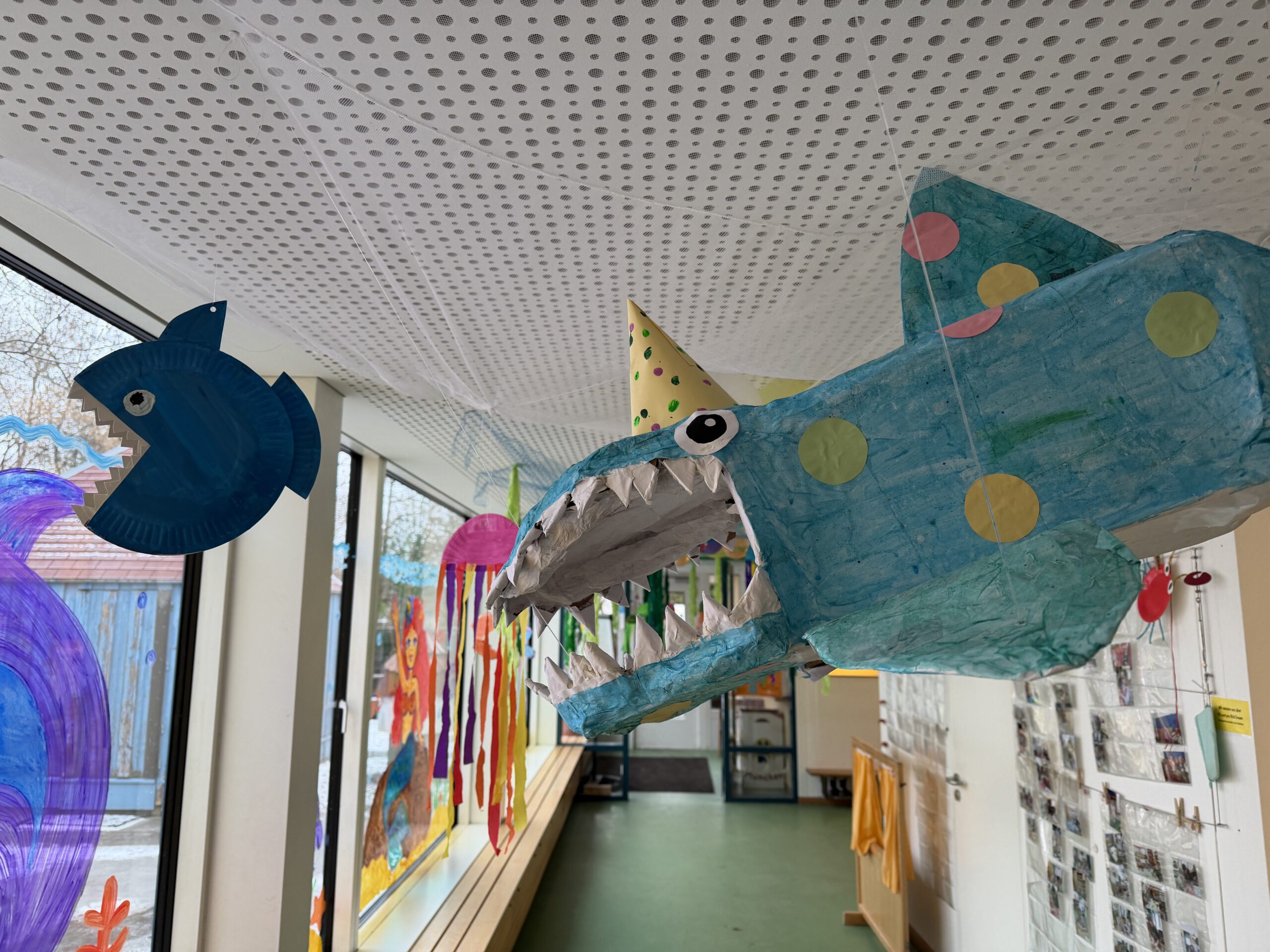 Warmherzig und offen wurden wir auch dieses Jahr beim Tag der offenen Tür empfangen. Schon beim Ankommen zog uns die eindrucksvolle Faschingsdekoration in den Bann: Eine große Haifigur „schwamm“ über unseren Köpfen hinweg, dazu liebevoll gestaltete Unterwasserwelten und Fenstermalereien mit Meerjungfrau, Hai und Schatztruhe – überall gab es etwas zu entdecken.