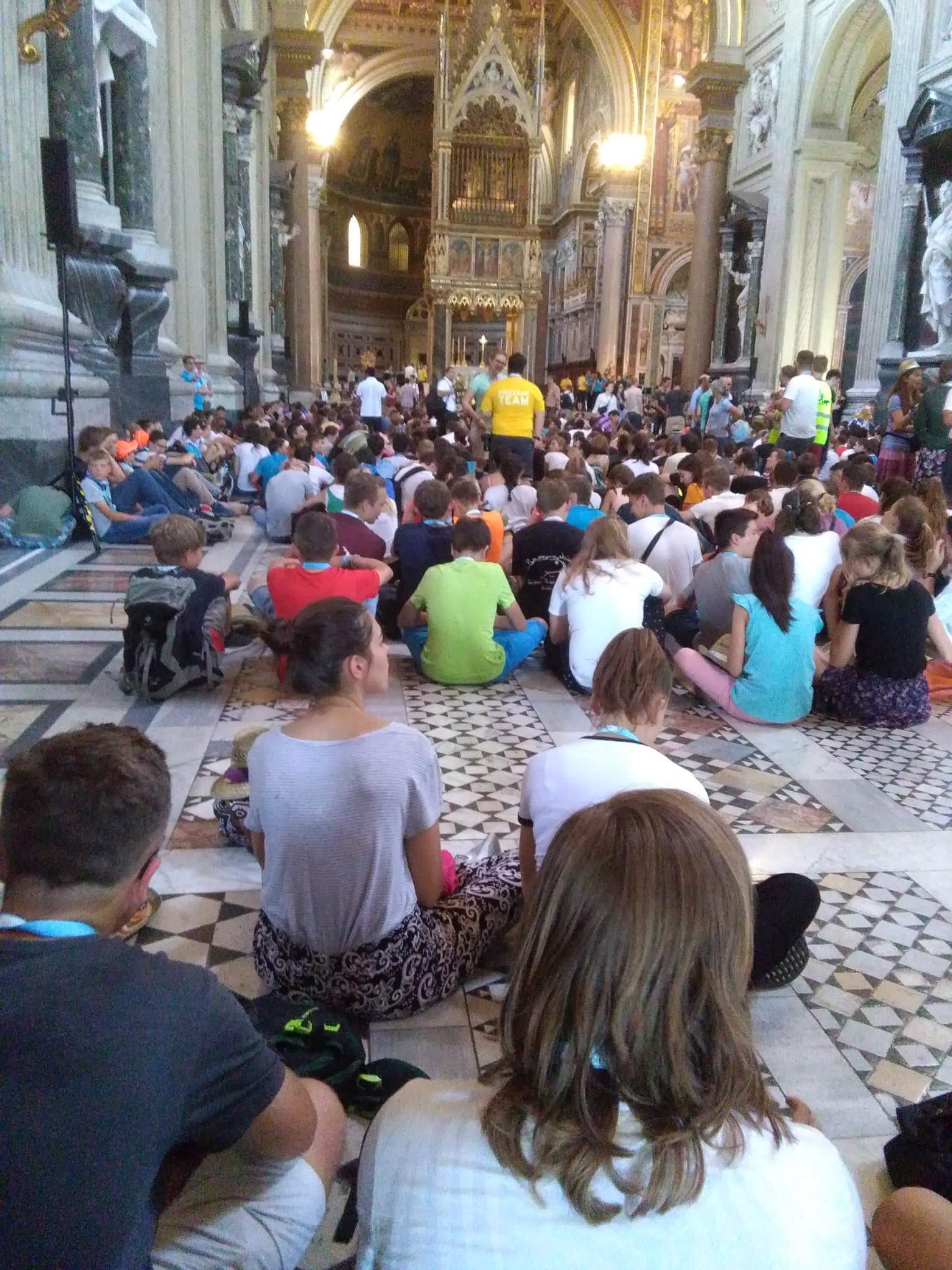 Auf dem Rückweg machten wir Halt im Supermarkt und deckten und mit Wasser, Keksen und ein bisschen Nahrung für das Abendessen ein. Wir vermuteten, dass wir ziemlich Hunger haben würden, da wir erst nach dem Eröffnungsgottesdienst etwas essen konnten. Dieser Gottesdienst fand für die Erzdiözese München-Freising in der Lateranbasilika statt. Das ist der eigentliche Bischofssitz von Rom, das heißt so wie die Frauenkirche in München – entsprechend groß und beeindruckend ist das Gebäude auch. Alle Sitzbänke waren abmontiert und wir saßen auf dem Boden, von wo wir die Messe von Bischof Bischof (der heißt echt so!) verfolgten. Ein besonderer Programmpunkt war das Mottolied der Wallfahrt (hier zum Nachhören: https://www.youtube.com/watch?v=70pAdUIIrr4) für das es auch eine Gebärdensprache-Variante gab, die wir jedes Mal tanzten, wenn das Lied zu hören war. Ich hab mir da ziemlich schwer getan, weil ich meine kurzen Ärmchen und Beinchen nicht so gut bewegen konnte, aber mir hat es schon Spaß gemacht, den anderen zuzuschauen.
